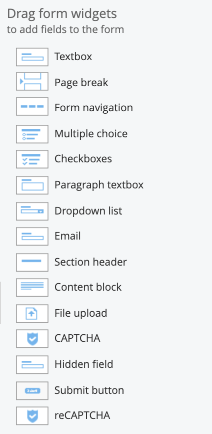 Note: You do not have to use every widget on your form, select only the ones that will work the best for the goals of the form.