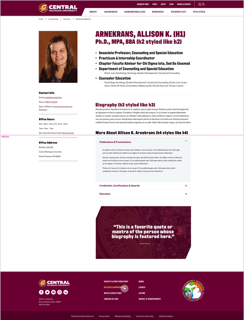 Quickly find a faculty or staff member's contact information, office hours, courses taught and more on their profile. All of this information is located in one central location to help our audience learn more about our fired up faculty and staff. The profile will appear when the faculty or staff's name is searched for on the site. This profile can also be linked directly in an email or email signature. There are many options to utilize the profile to bring more awareness of our faculty and staff.