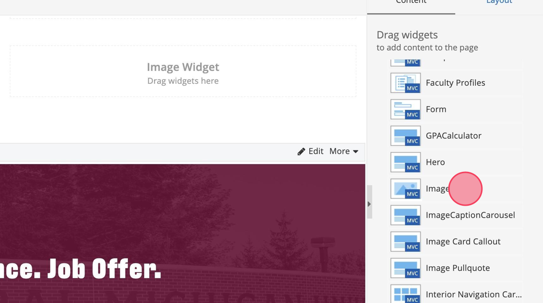 5. Scroll down to find "Image", and drag and drop it into the correct spot labeled "Image Widget".