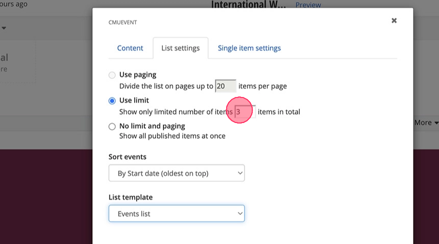 17. Next click the dropdown menu under "List template" and select the "Featured events" option.