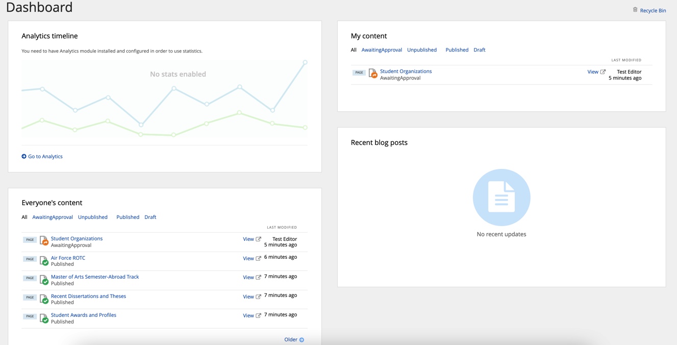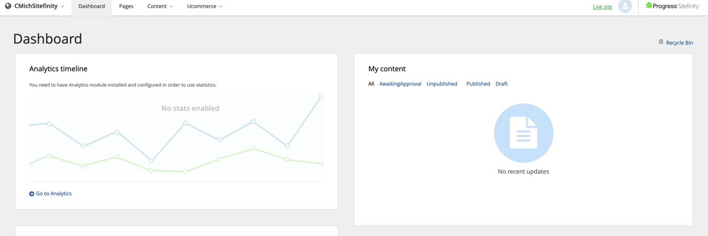 Upon logging into Sitefinity, the Dashboard will display information related to your role as editor.
