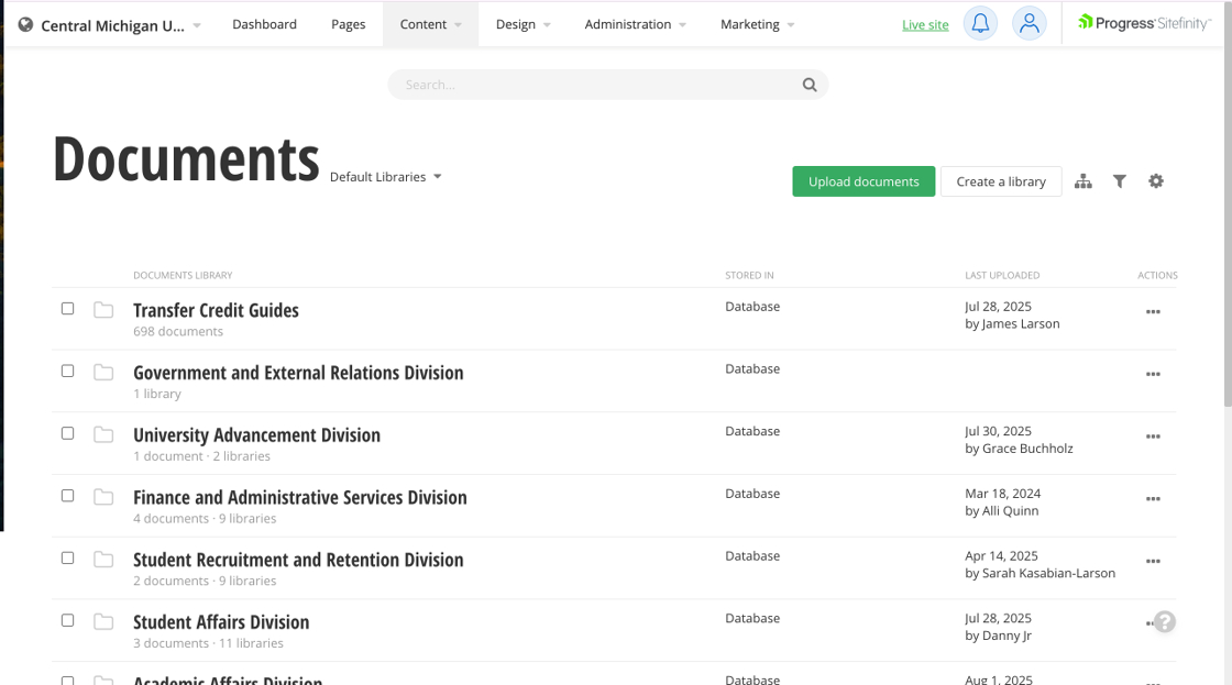 The Document Library is made up of individual libraries (called folders). It is organized by university division, with each folder containing sub-folders for the departments within the division.