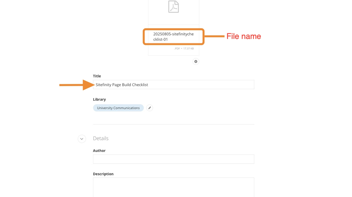 The title is not the same as the file name. It should clearly describe the PDF’s content and reflect the terms users are likely to search for.