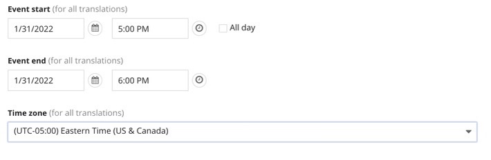 - Fill in the event start and end times. Be sure to have the correct timezone (EST) selected from the drop-down.