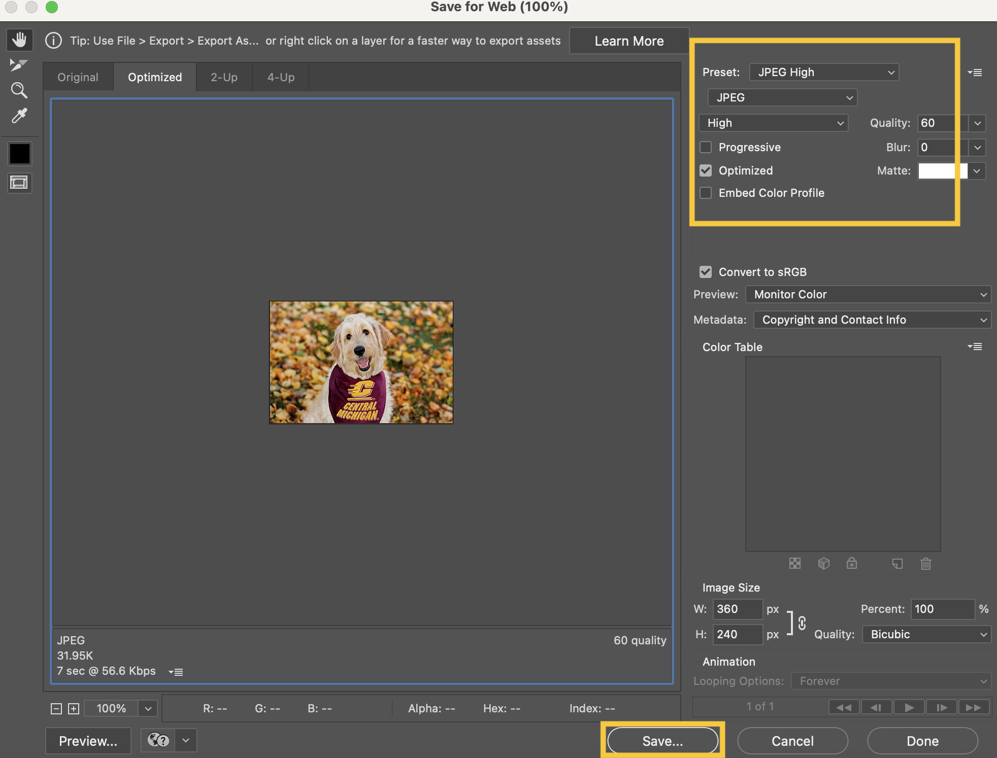 10. Verify the image format is either .JPG or .PNG under Preset.