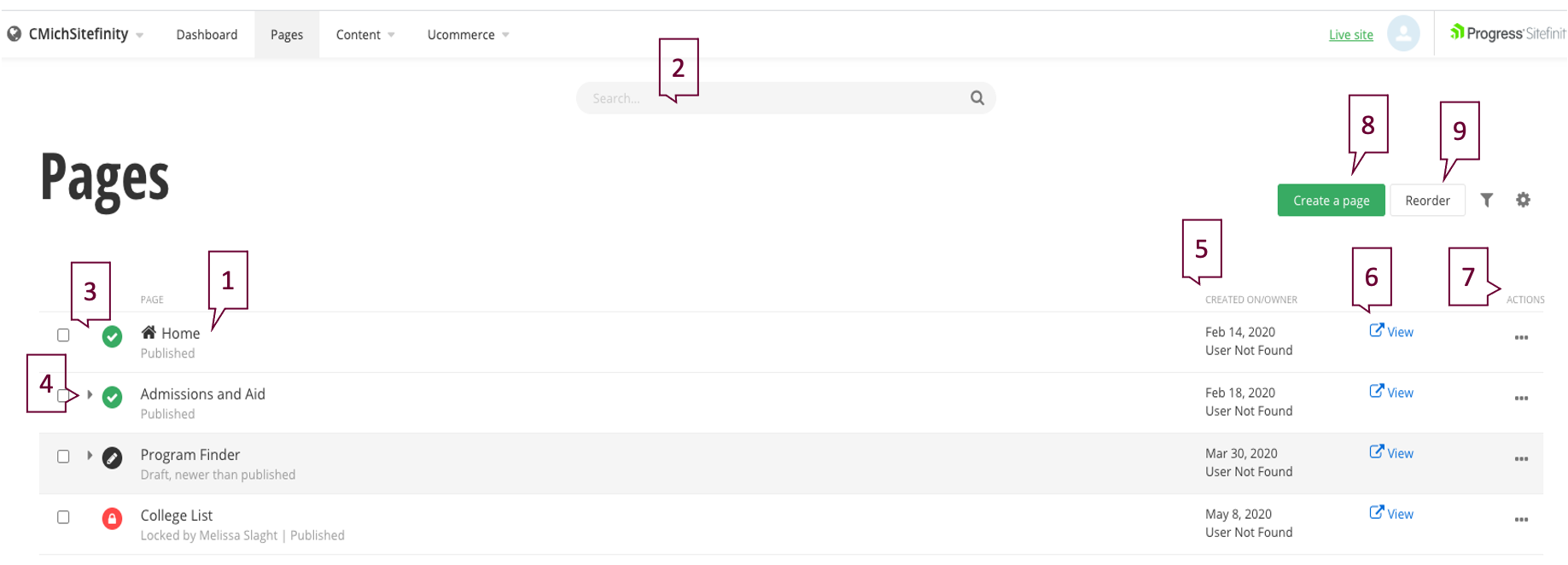 In the Pages section, you will find a complete list of all pages built within Sitefinity and the status of those pages. This is where you'll start creating or editing a page.