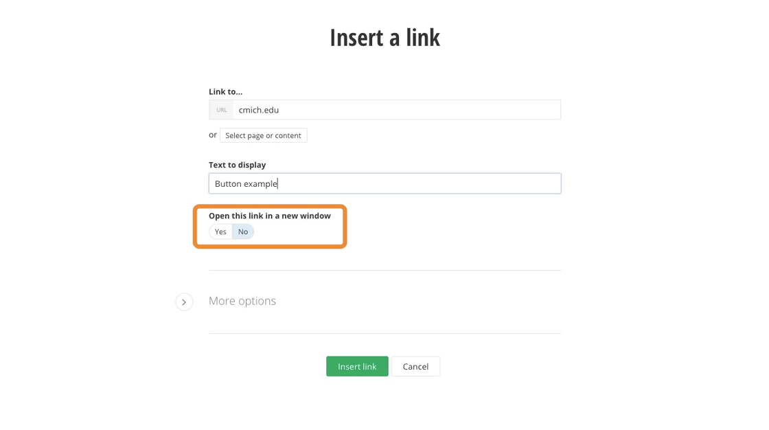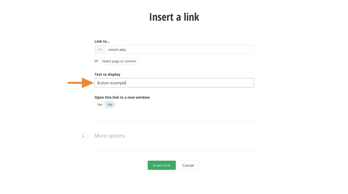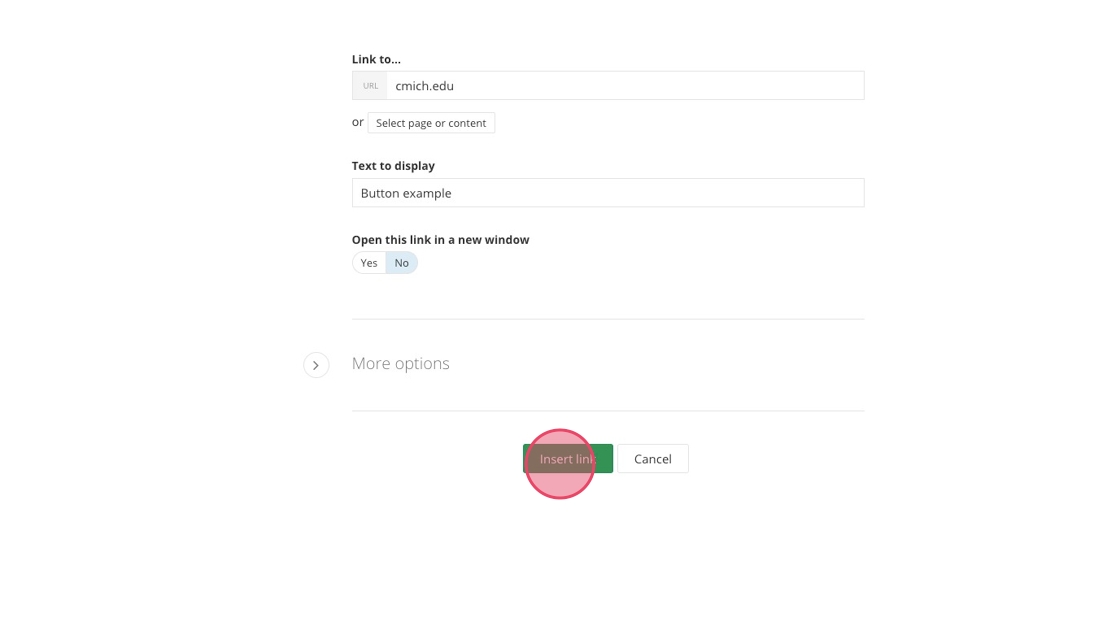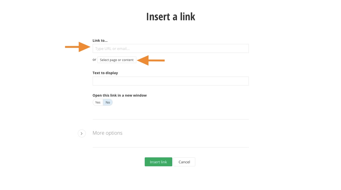 9. Either fill in the "Link to..." field with a specific URL or click "Select page or content" button to choose a page or document within the site.