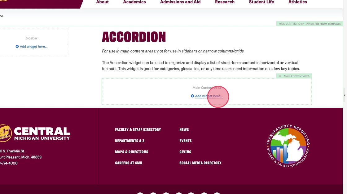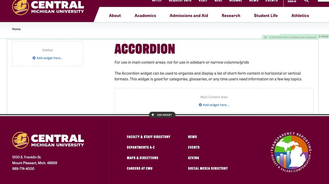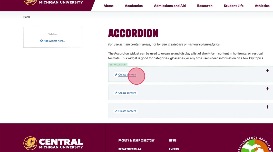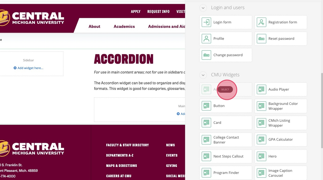 3. Click on Accordion under CMU Widgets and then "Select". Add three to five Accordions, stacking each widget immediately below each other.