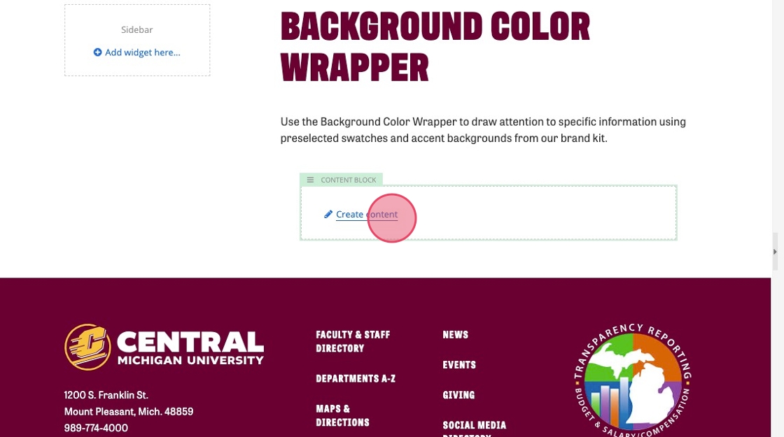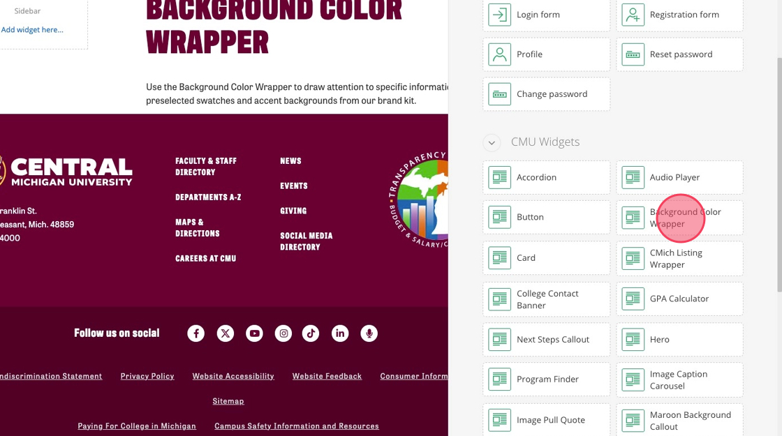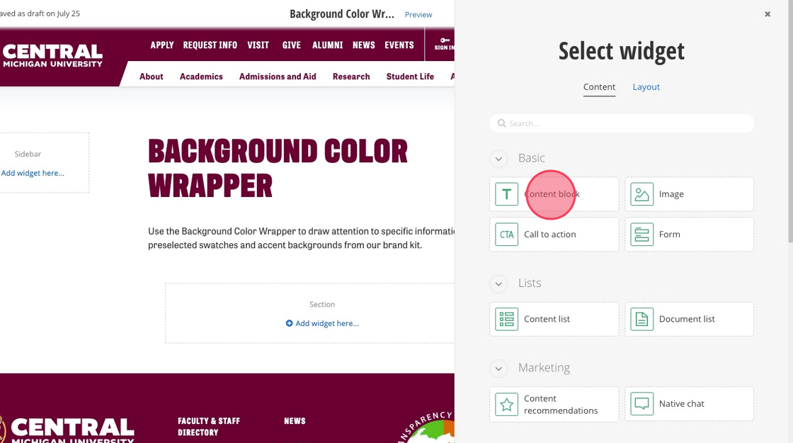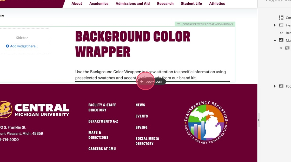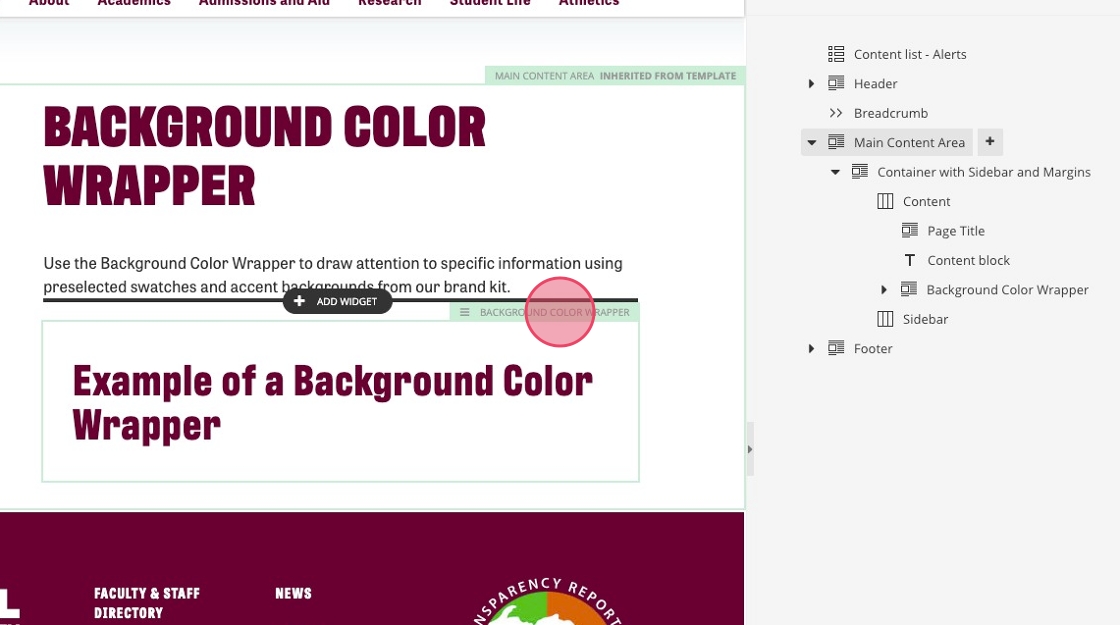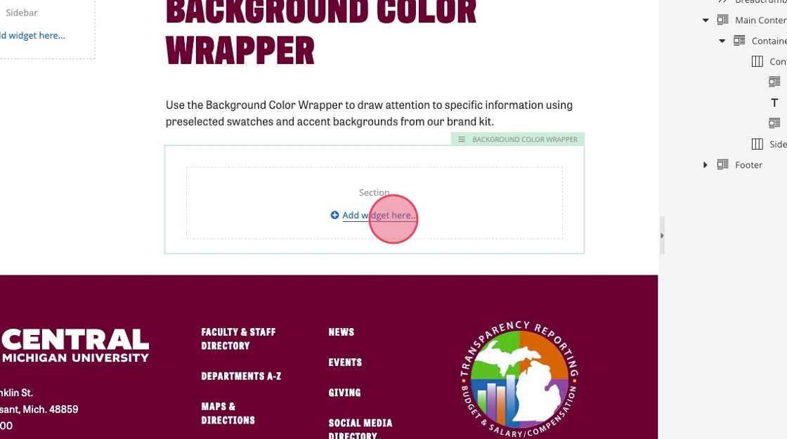 3. You'll notice that the Background Color Wrapper already has a section built into it, so there is no need to add one. Click "Add widget here..." within the section.