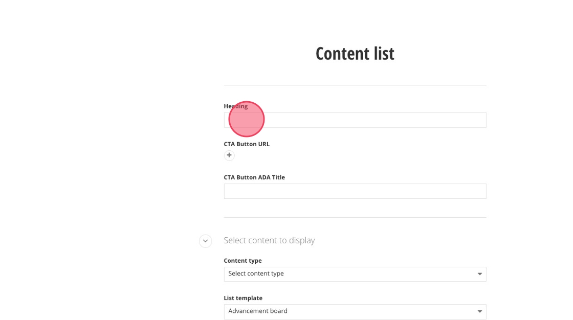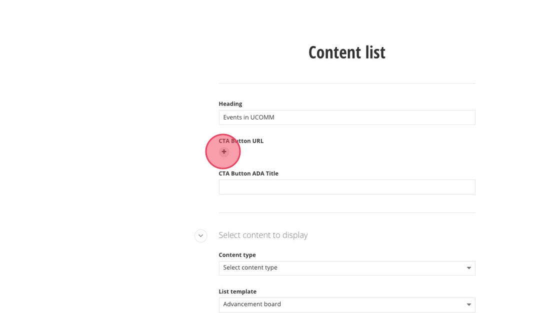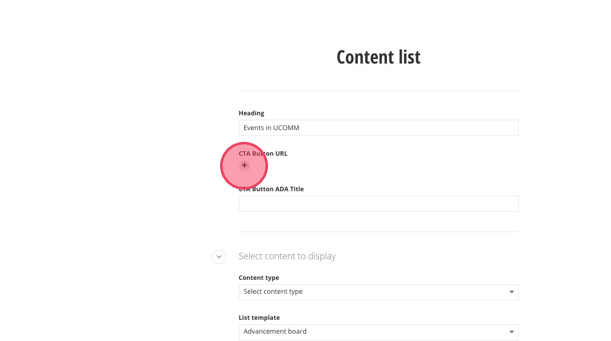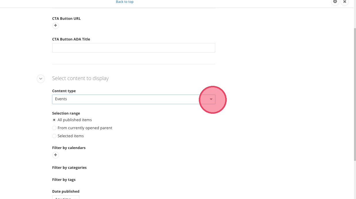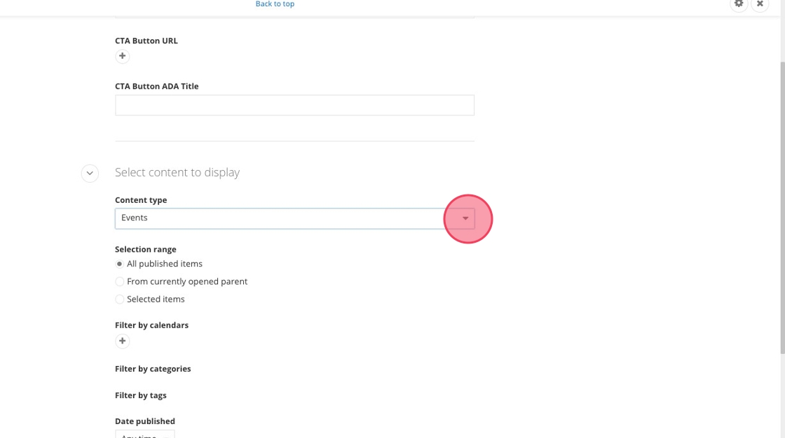 5. OPTIONAL: You can have a button at the top of the widget that links users to more events if you would like. Please be sure to fill in the CTA ADA title field as well.