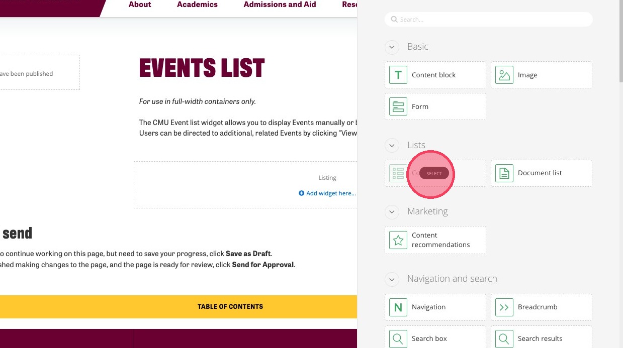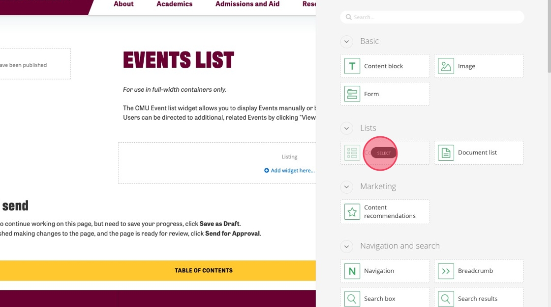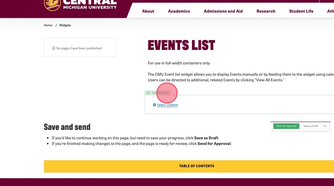 The CMU Event list widget allows you to display Events manually or by feeding them to the widget using categories.