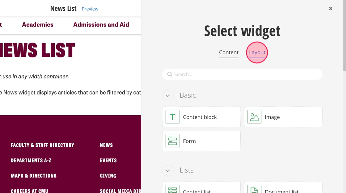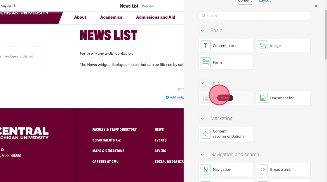5. Under Content, find the Content List widget and select it.