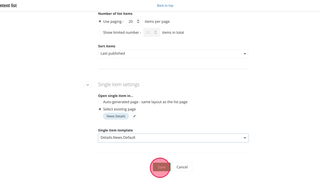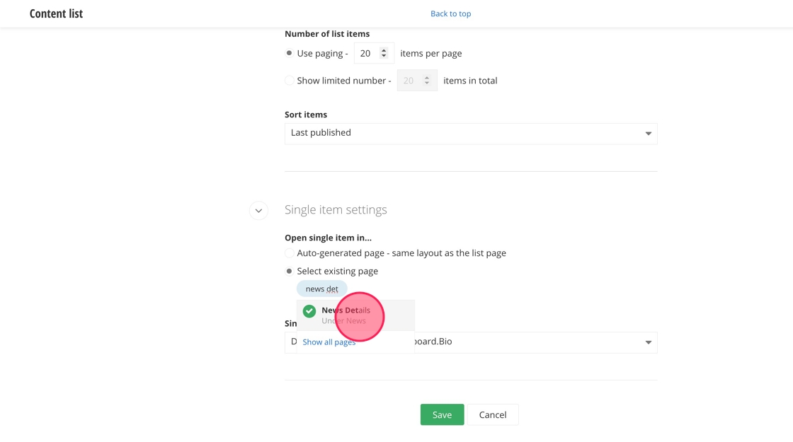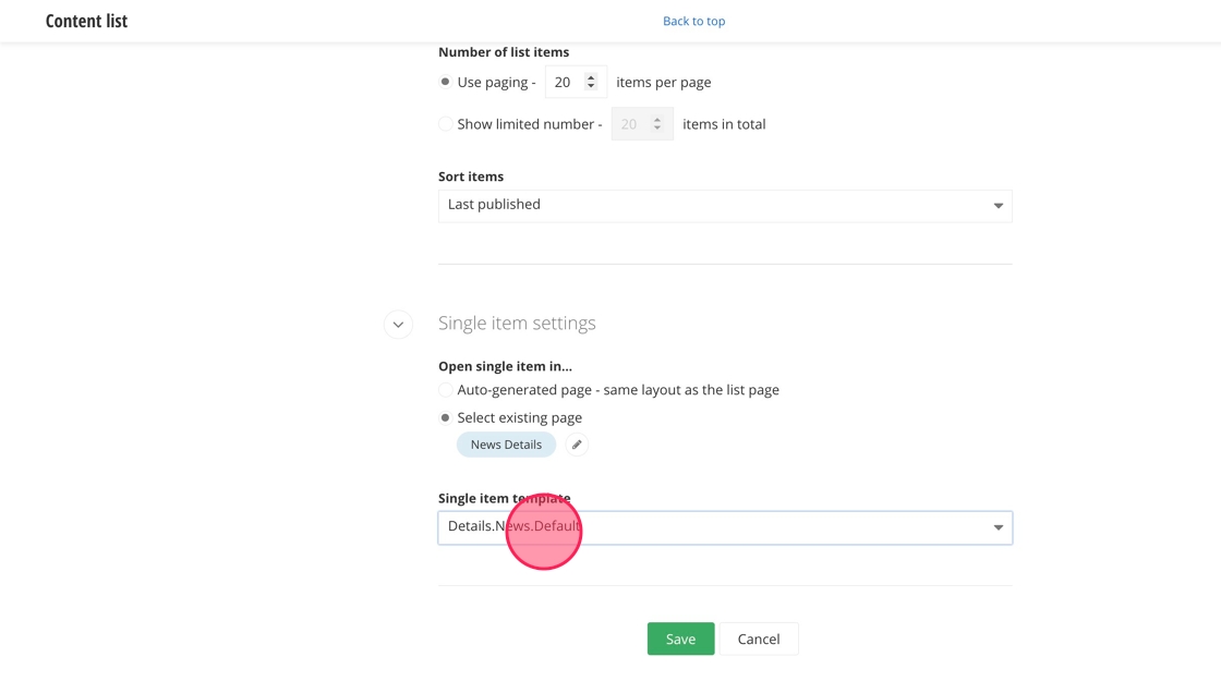 25. Select the "Details.News.Default" option from the dropdown menu under Single item template.
