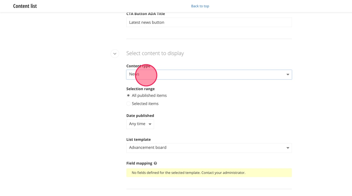 14. Under "Select content to display," change the Content type to News.