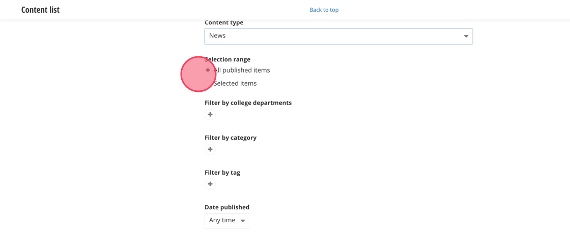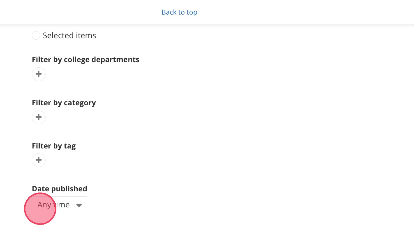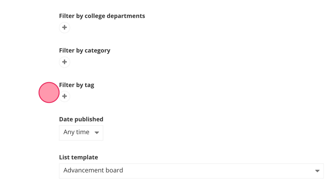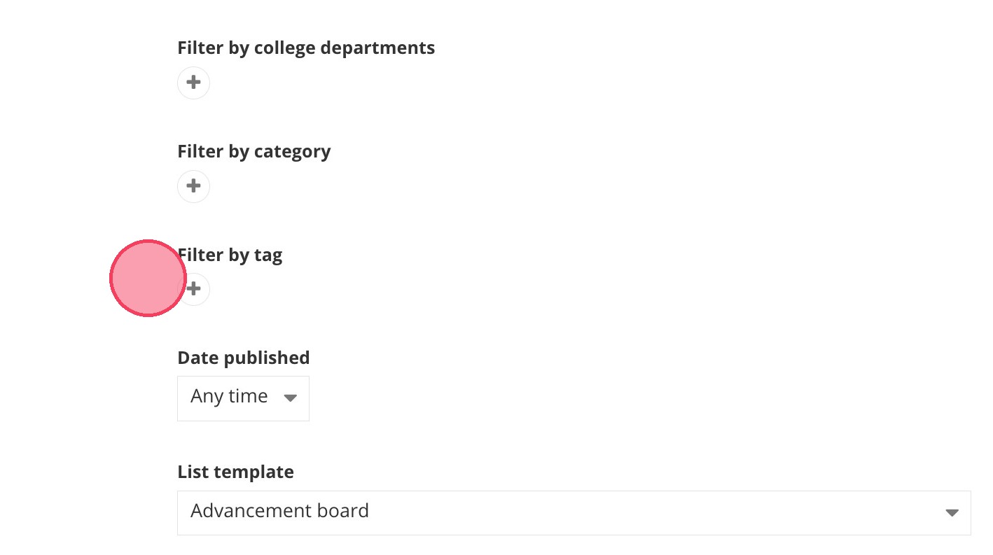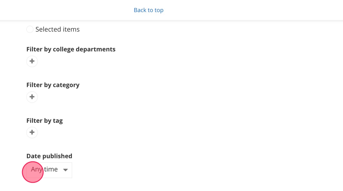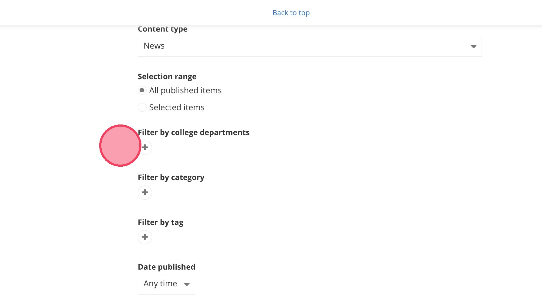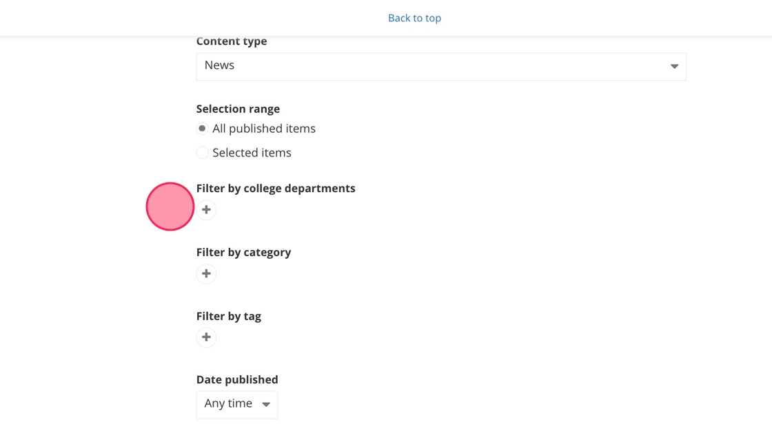 16. - Filter by college departments: Show only news stories with a specific college department added to them. Select the college department by clicking on the +.
