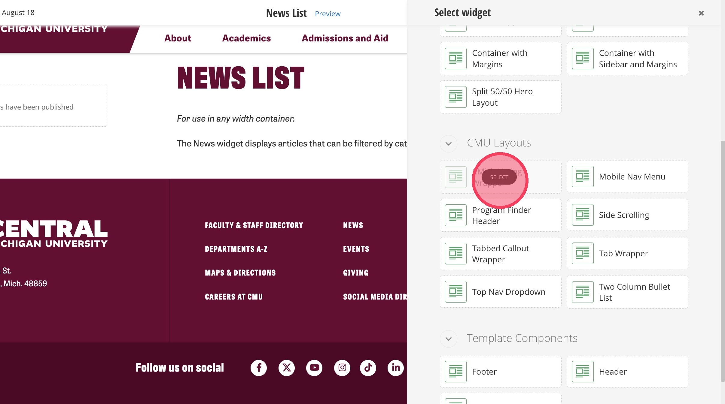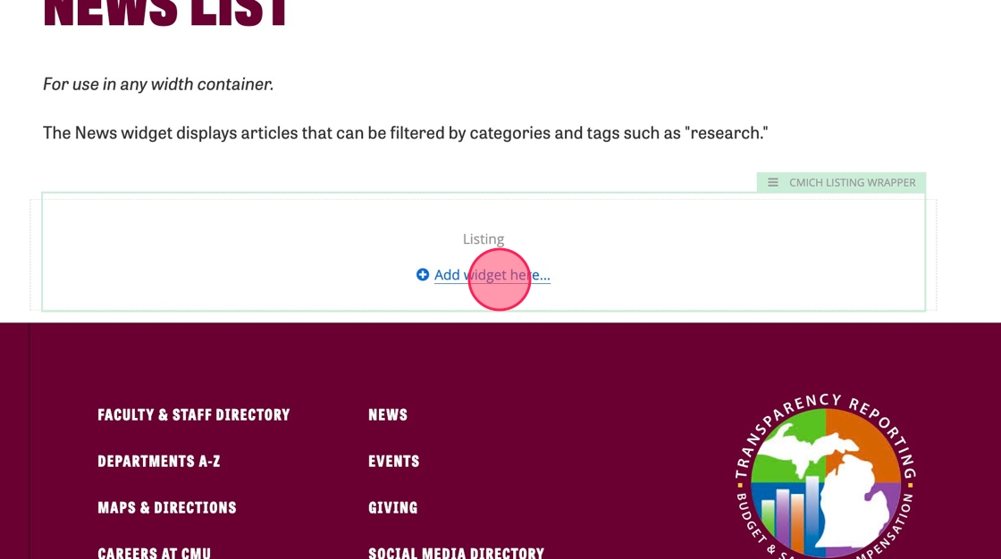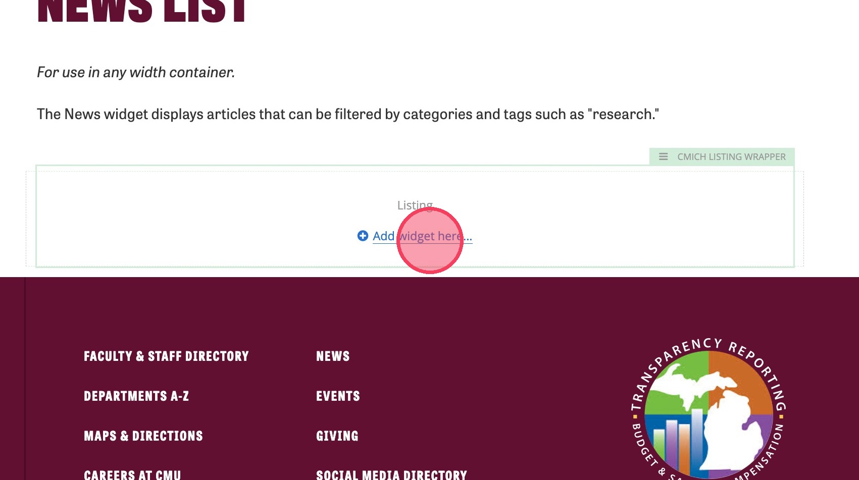 4. In the CMICH Listing Wrapper, click on "Add widget here."