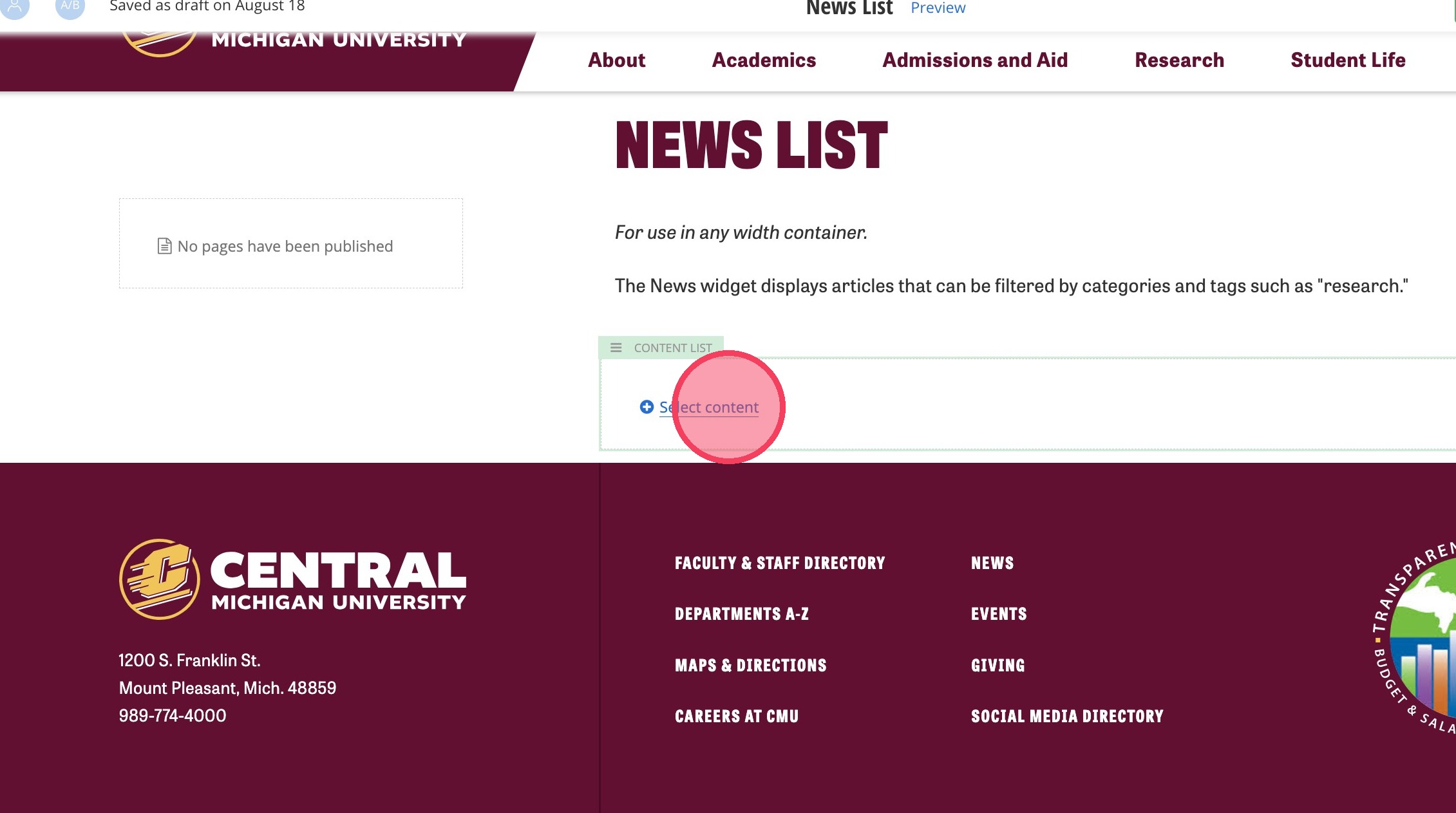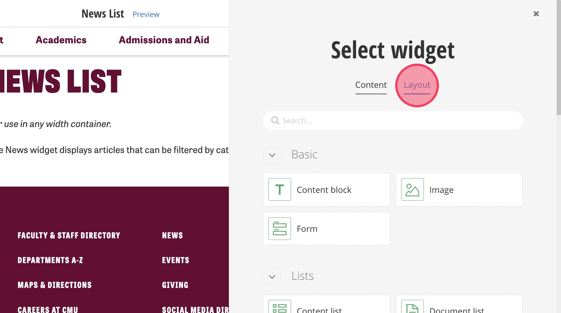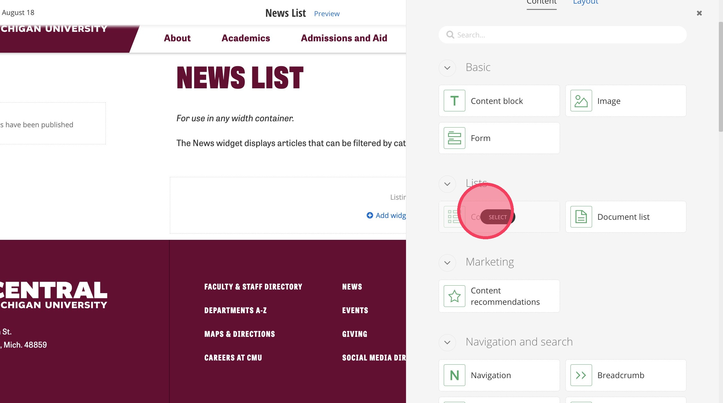 4. In the CMICH Listing Wrapper, click on "Add widget here."