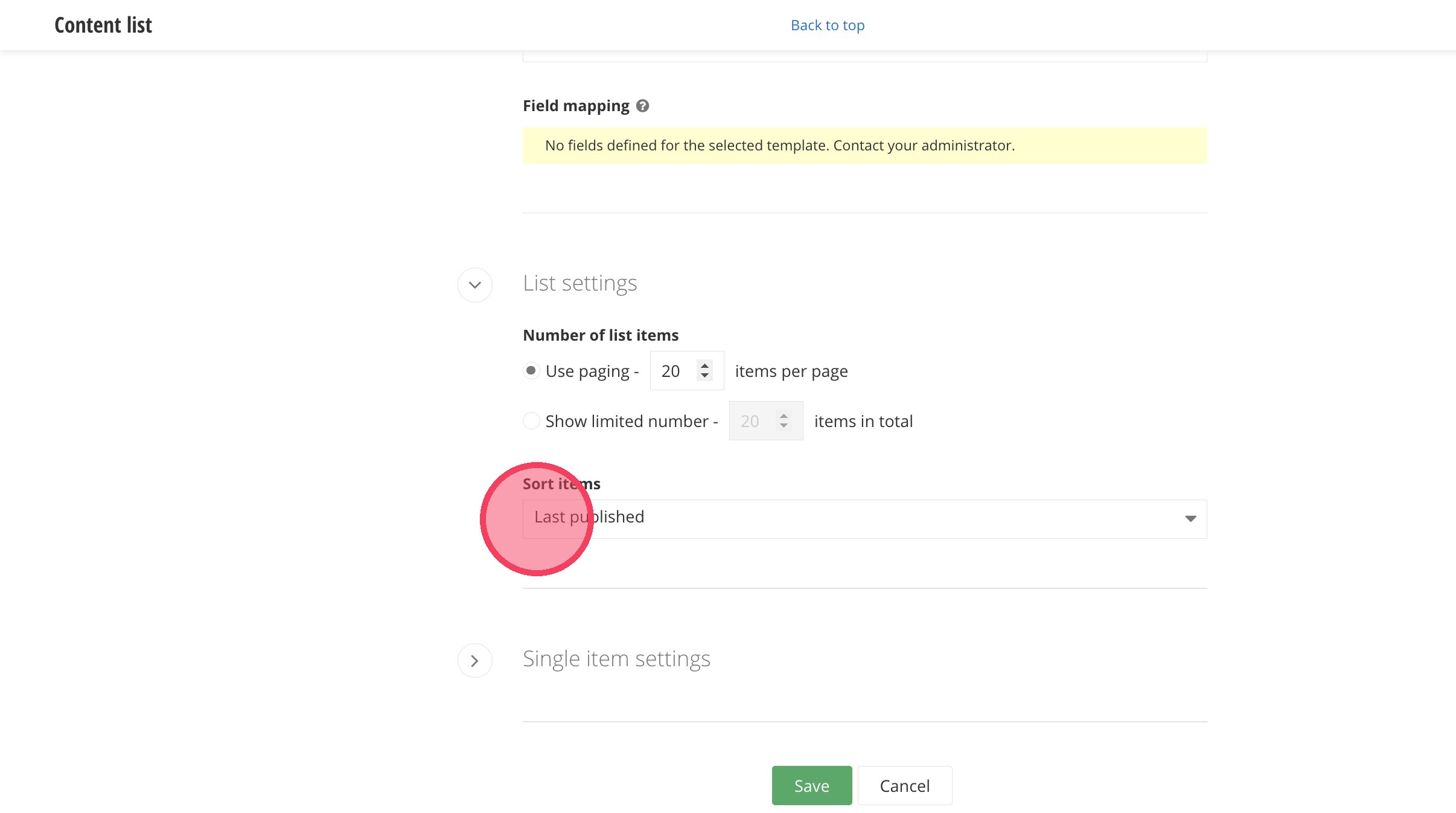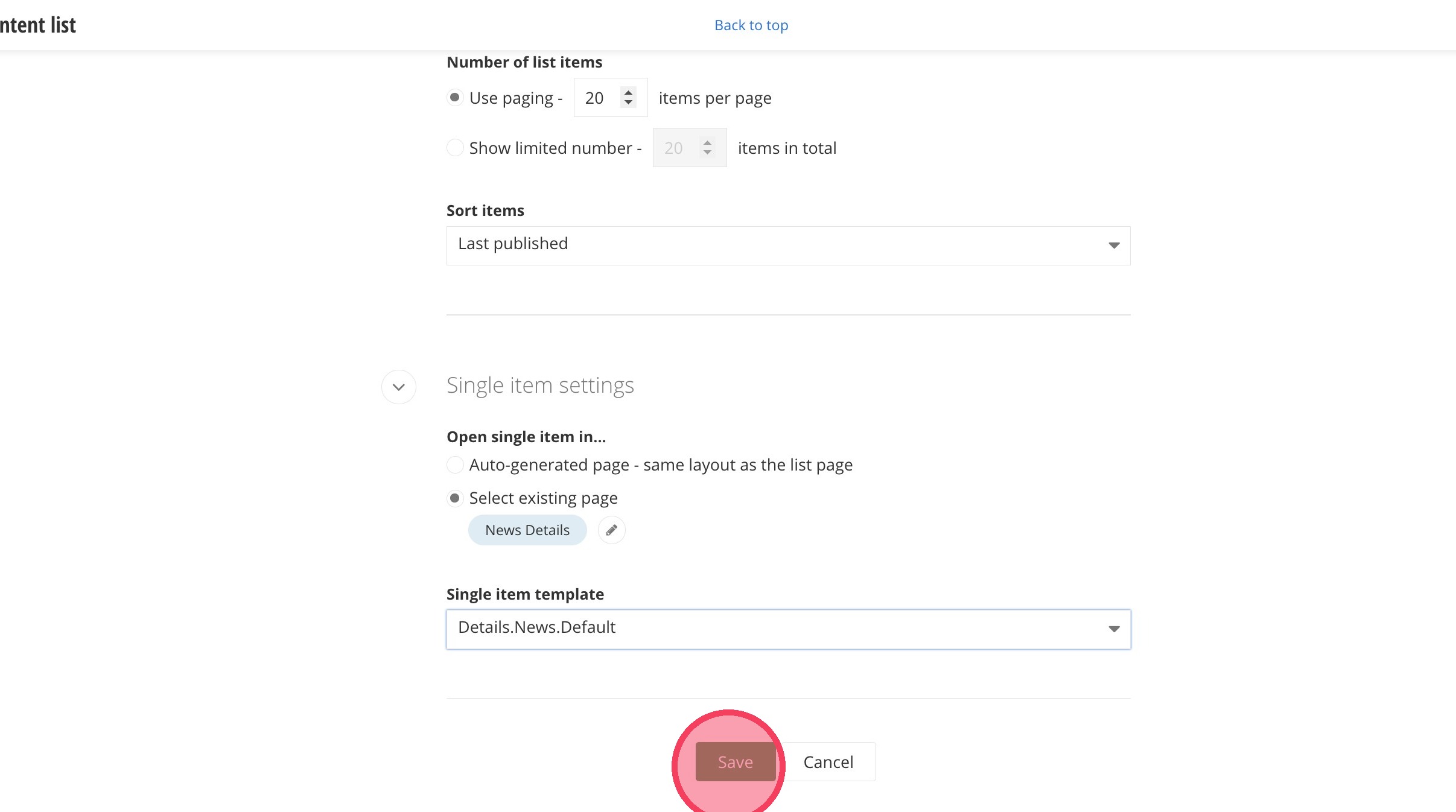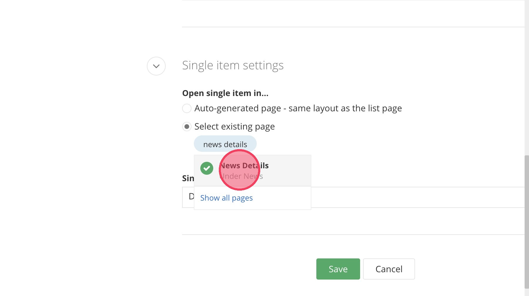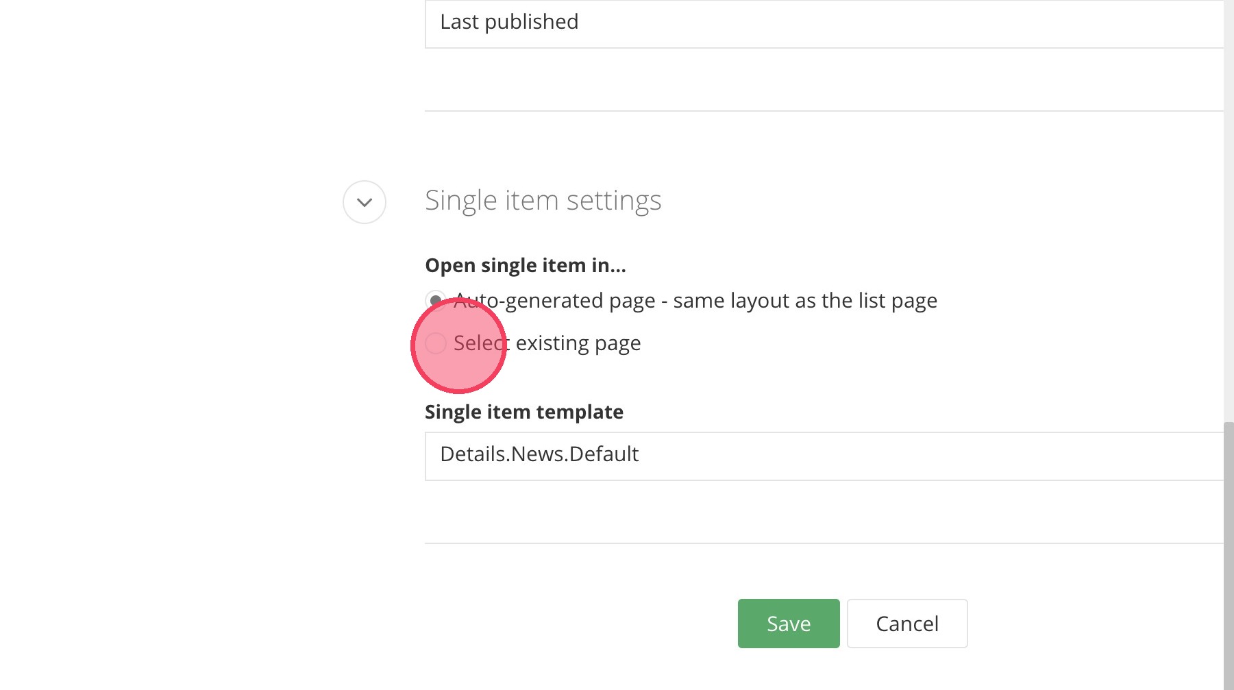 28. Select the "Details.News.Default" option from the dropdown menu under Single item template.