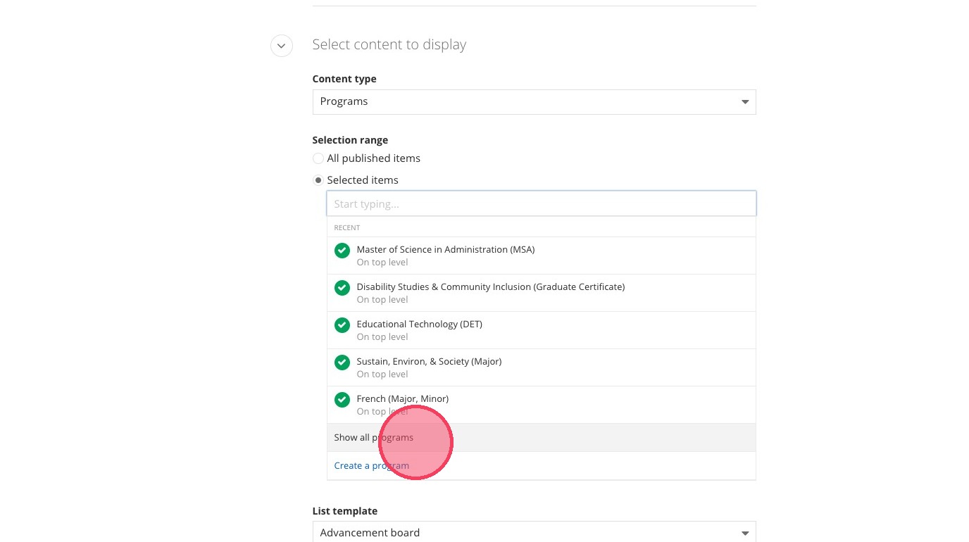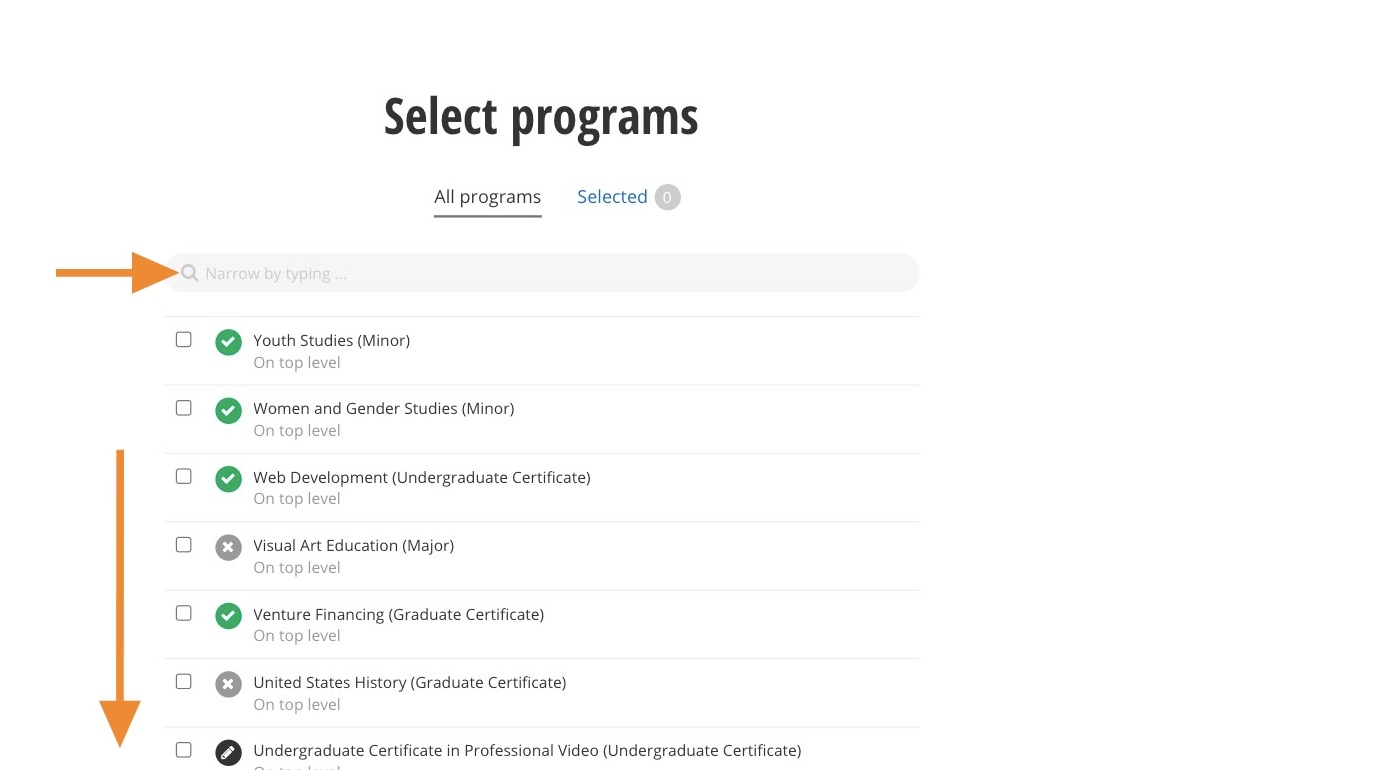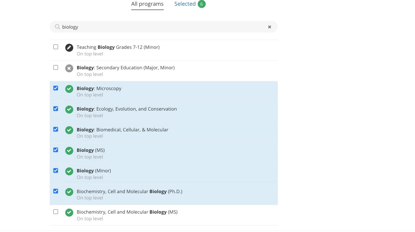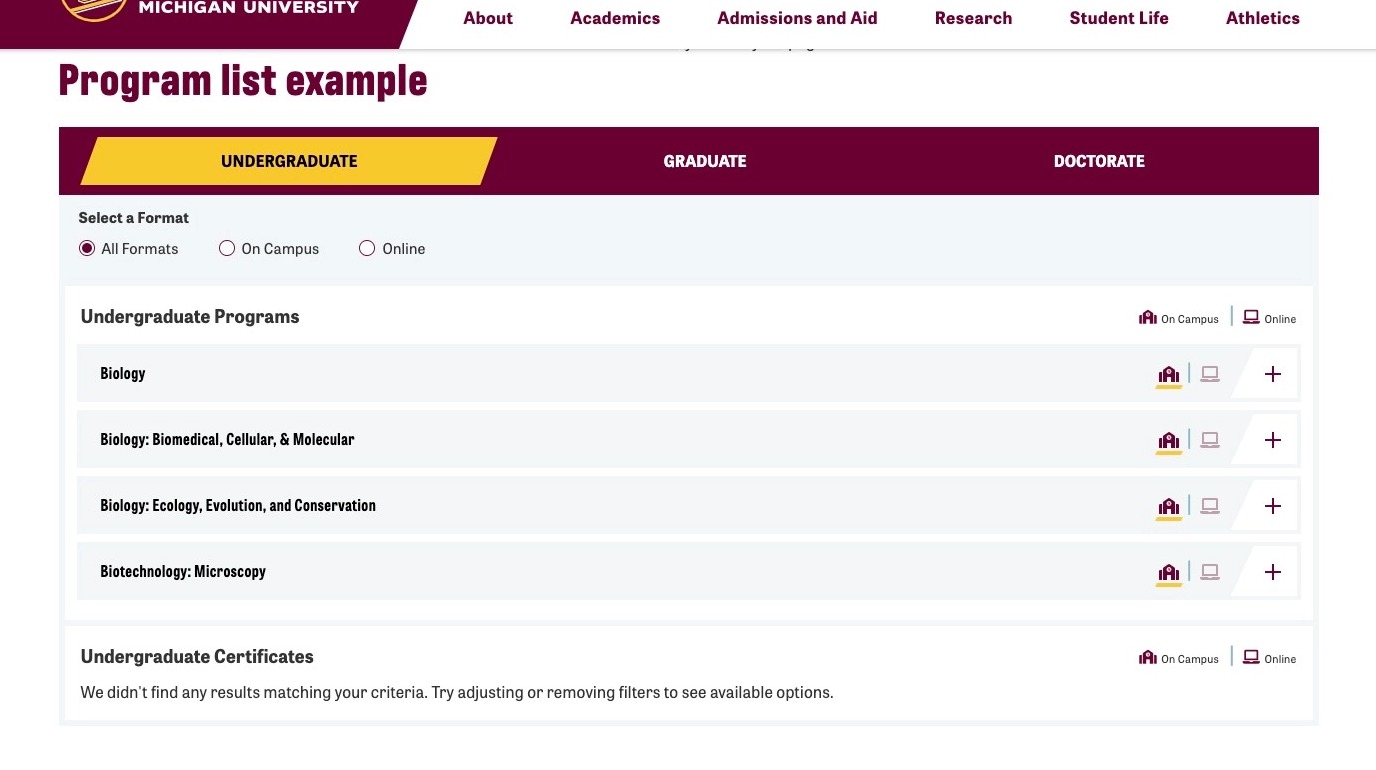 Show what your department or college has to offer. The Program List lets students discover majors, minors and certificates the moment they land on your page.