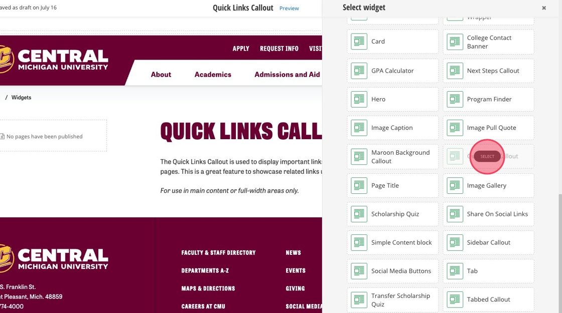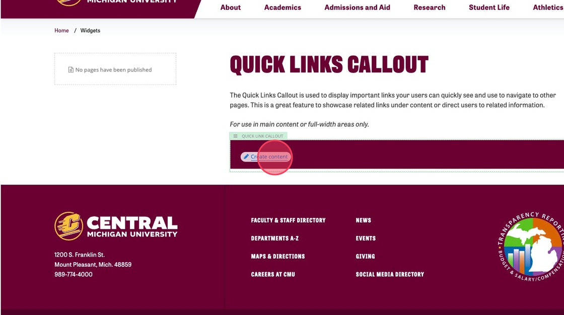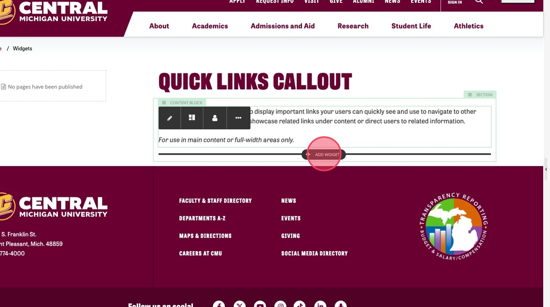 1. Click 'Add Widget' where you want to add the quick links callout.