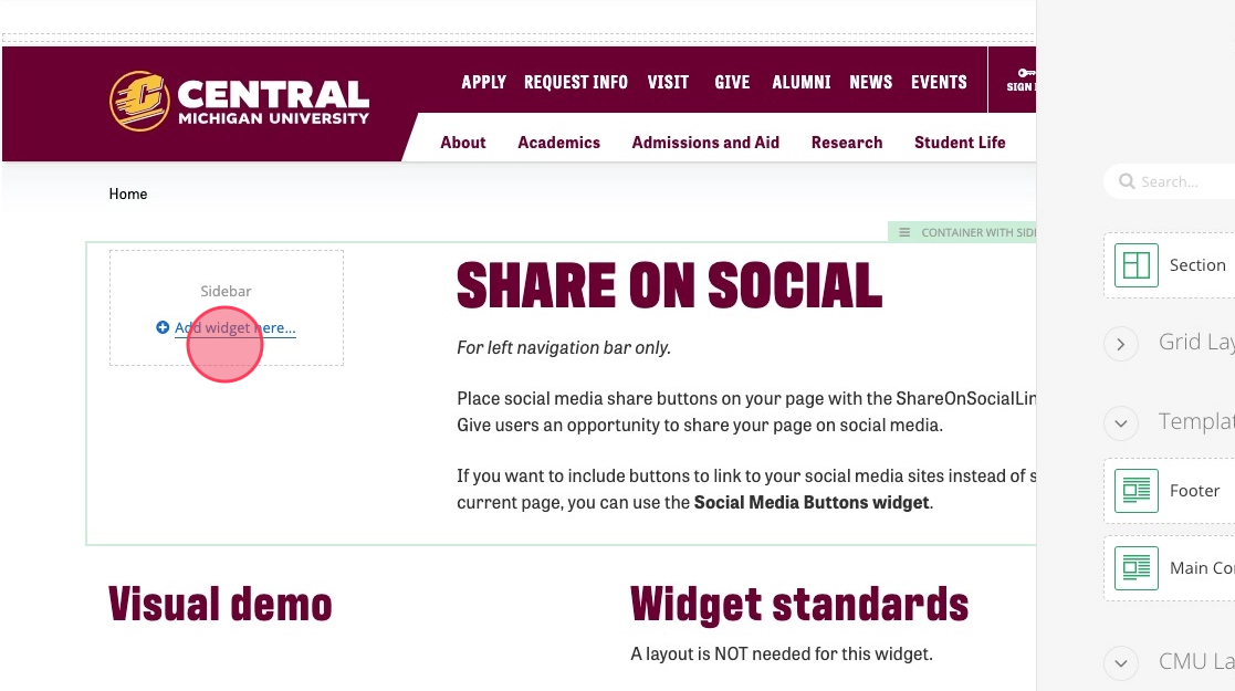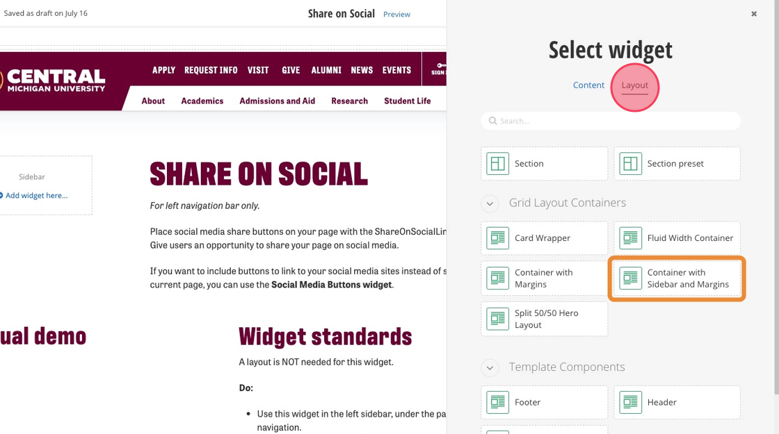 1. Before getting started, ensure your page has a "Container with Sidebar and Margins". You can find this by clicking "Layout" in the side widget selection.